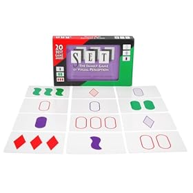This game is great for pattern recognition. You've got 12 cards on the table and all of them are different. Can you find 3 where all their characteristics are similar or different. This is also a great game to help teach very basic skills for understanding "same" and "different". As kids get older, you can adapt the game to be more challenging by relying on speed.